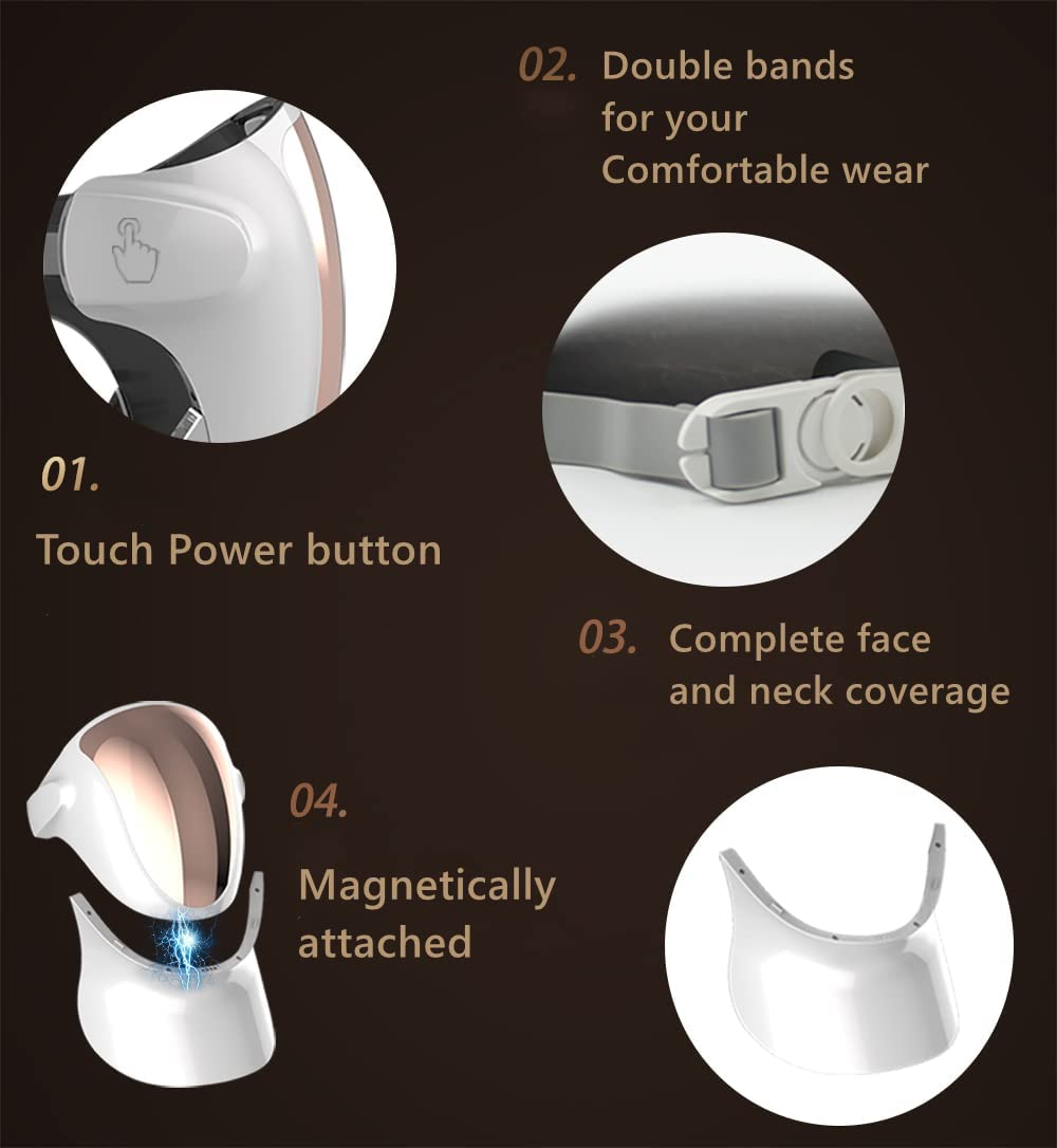 • PATENTED DESIGN WITH FULL FACE AND NECK COVERAGE The Neck Cover is a patented design that uses magnets to secure to the face mask. You can line up or take off neck mask any time-use the face mask alone or use face+neck at the same time! Simply press the touch pad on the upper right side of the mask to power on and off.